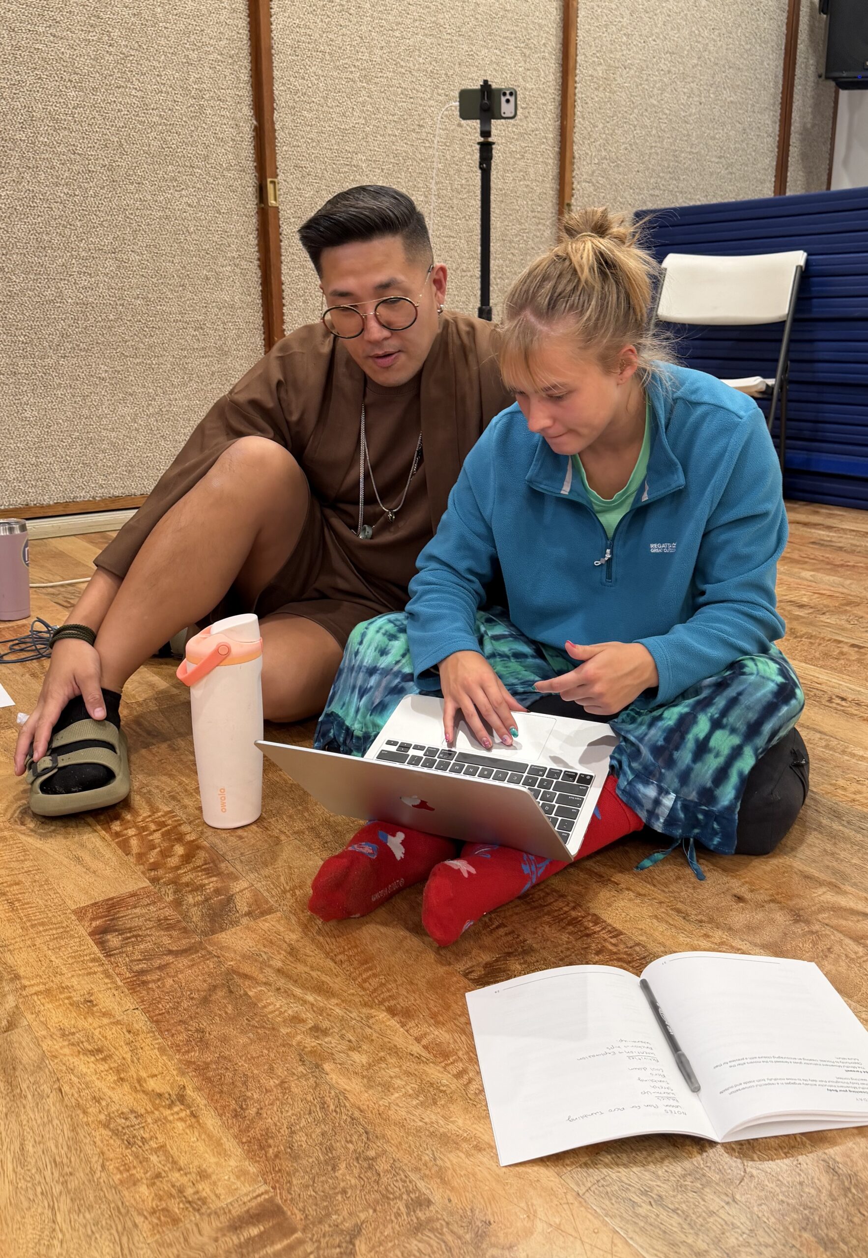 Another favorite frame: By midweek, we detected that our Trainees seemed a bit listless – we’d been charging pretty hard, and ‘’hump day” – meaning Wednesday, the midpoint of the typical work week – is a real phenomenon! Never fear, Dustin to the rescue! Using his full body vocal coaching skills, Senior Intern Trainer Dustin led us in a rousing mindful movement session to exercise our voices. The topic was Finding our Safe Edge. Dustin had us sense our way into finding that safe edge of volume with our voices, just as we sense our way into finding the safe edge of our range of movement.
