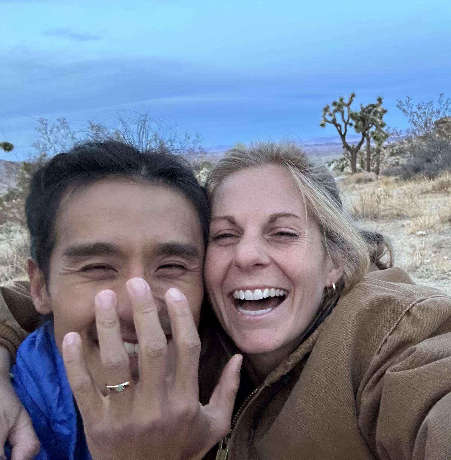 The following January, back with Eva’s family in California, Eva staged a moment of her own. On a trail near Joshua Tree, she and her sisters decorated a bush with tinsel and blankets. Later that afternoon, Eva led Thuan there, and as they sat talking, she slipped him a note from her jacket. At first he hadn’t noticed anything unusual. Suddenly, something seemed different. Then came the ring. Surprised and overjoyed, Thuan said simply, “I would and I do.”